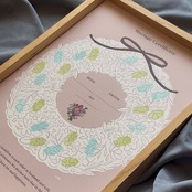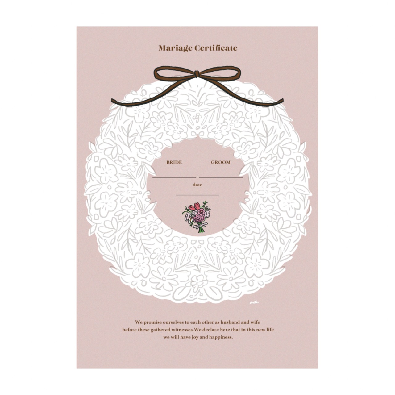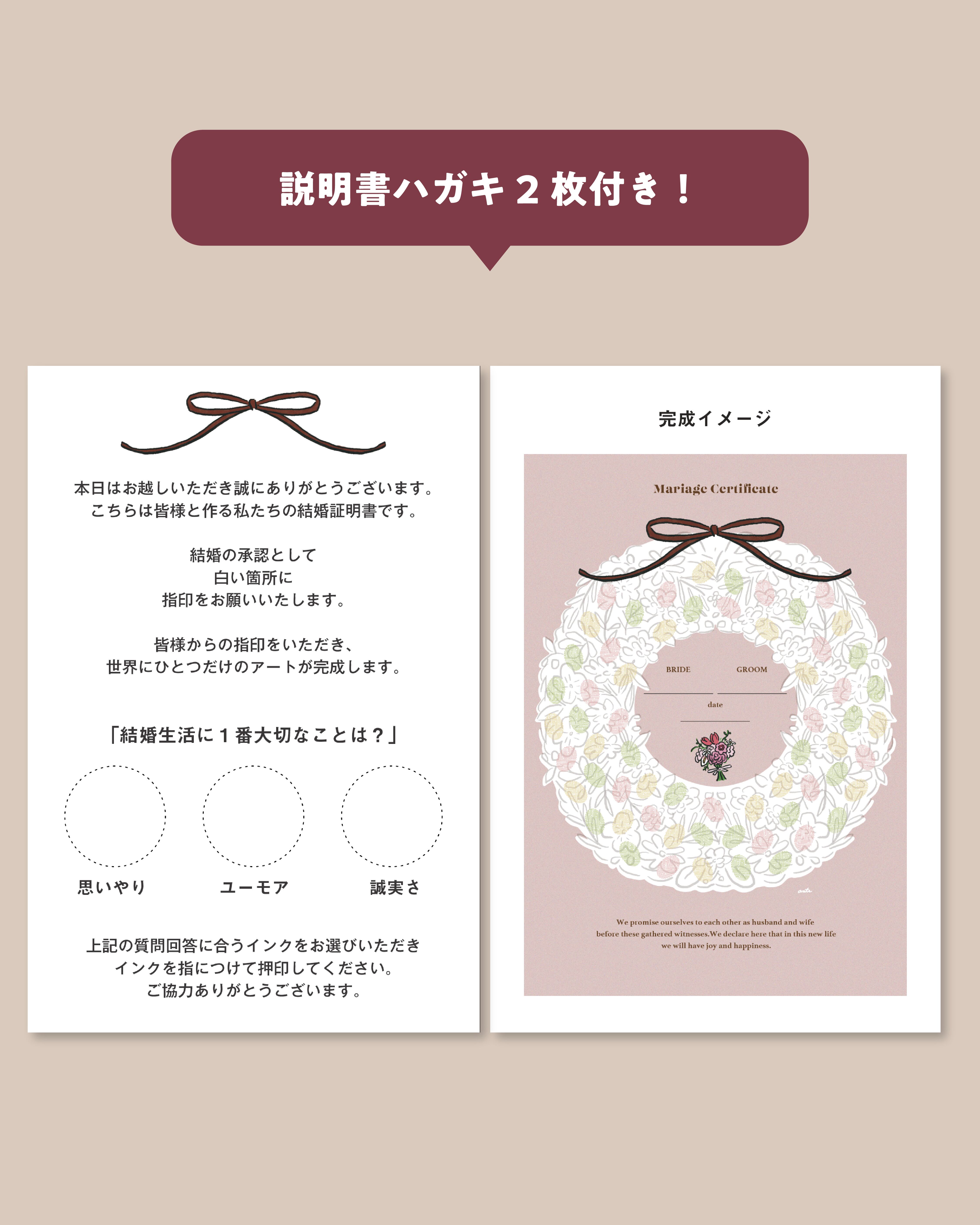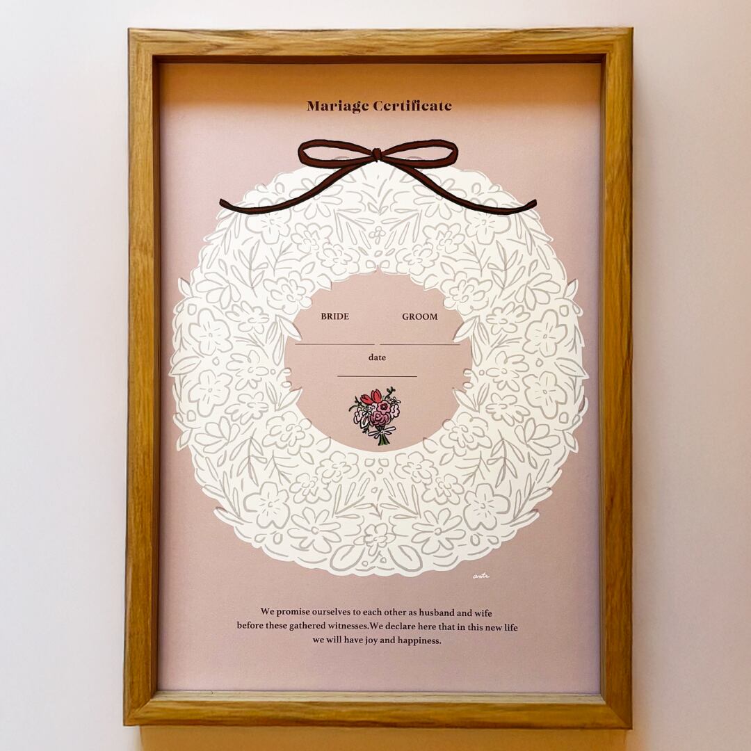 リース型の白枠にスタンプを押していただくデザインの結婚証明書です。