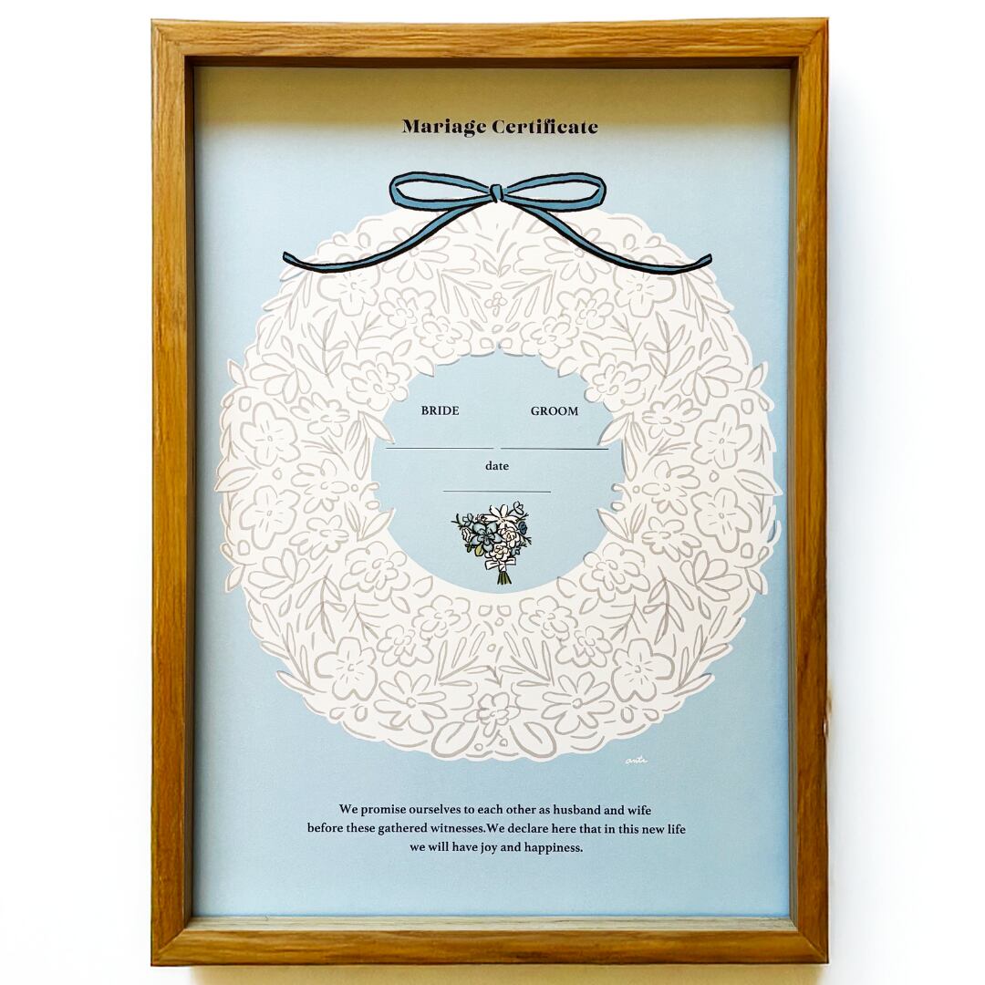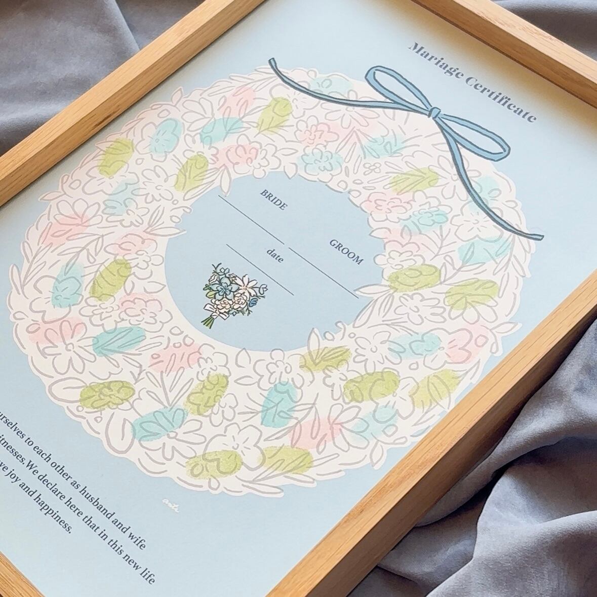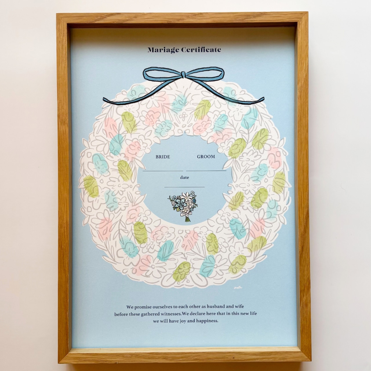 リース型の白枠にスタンプを押していただくデザインの結婚証明書です。