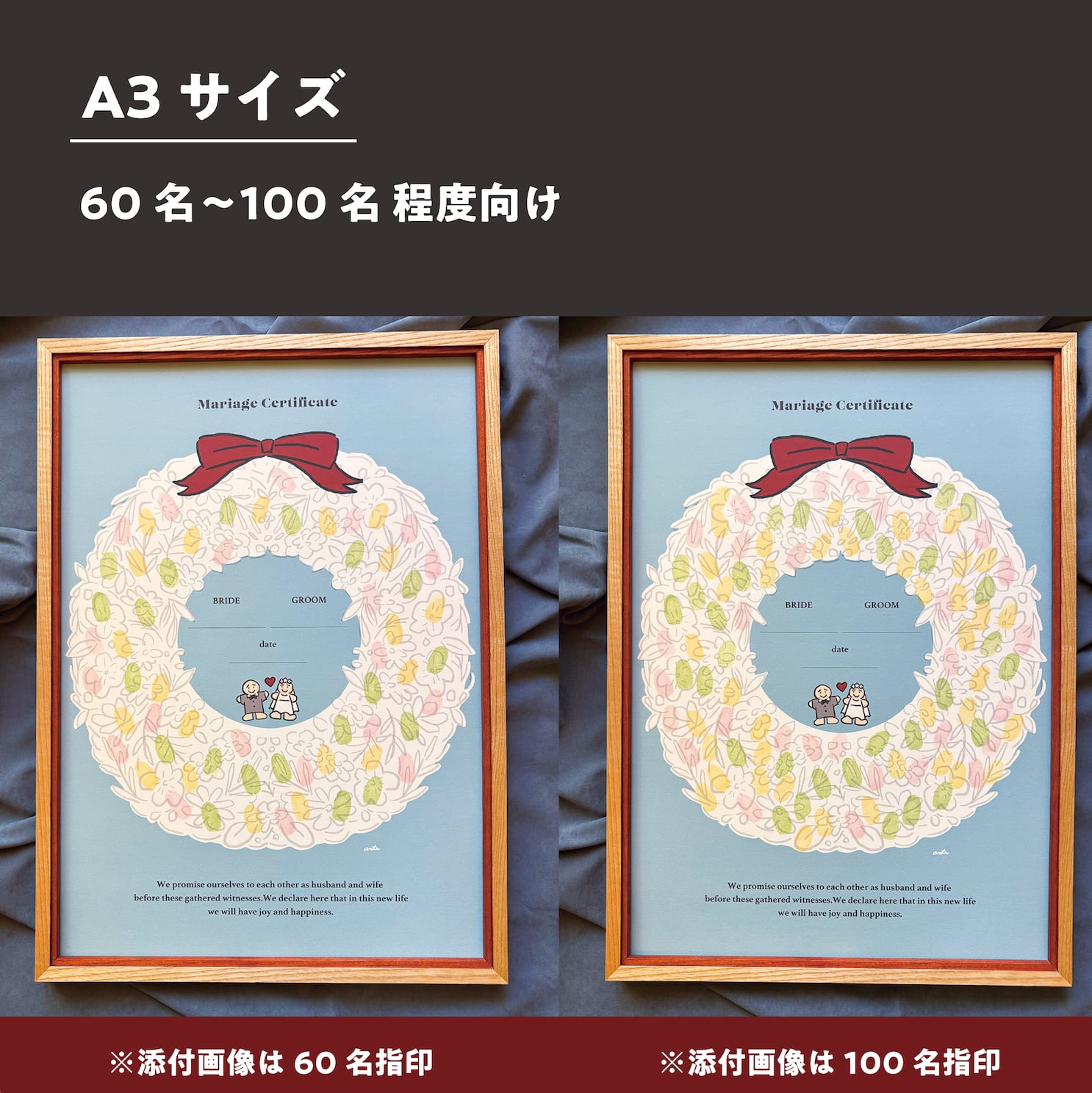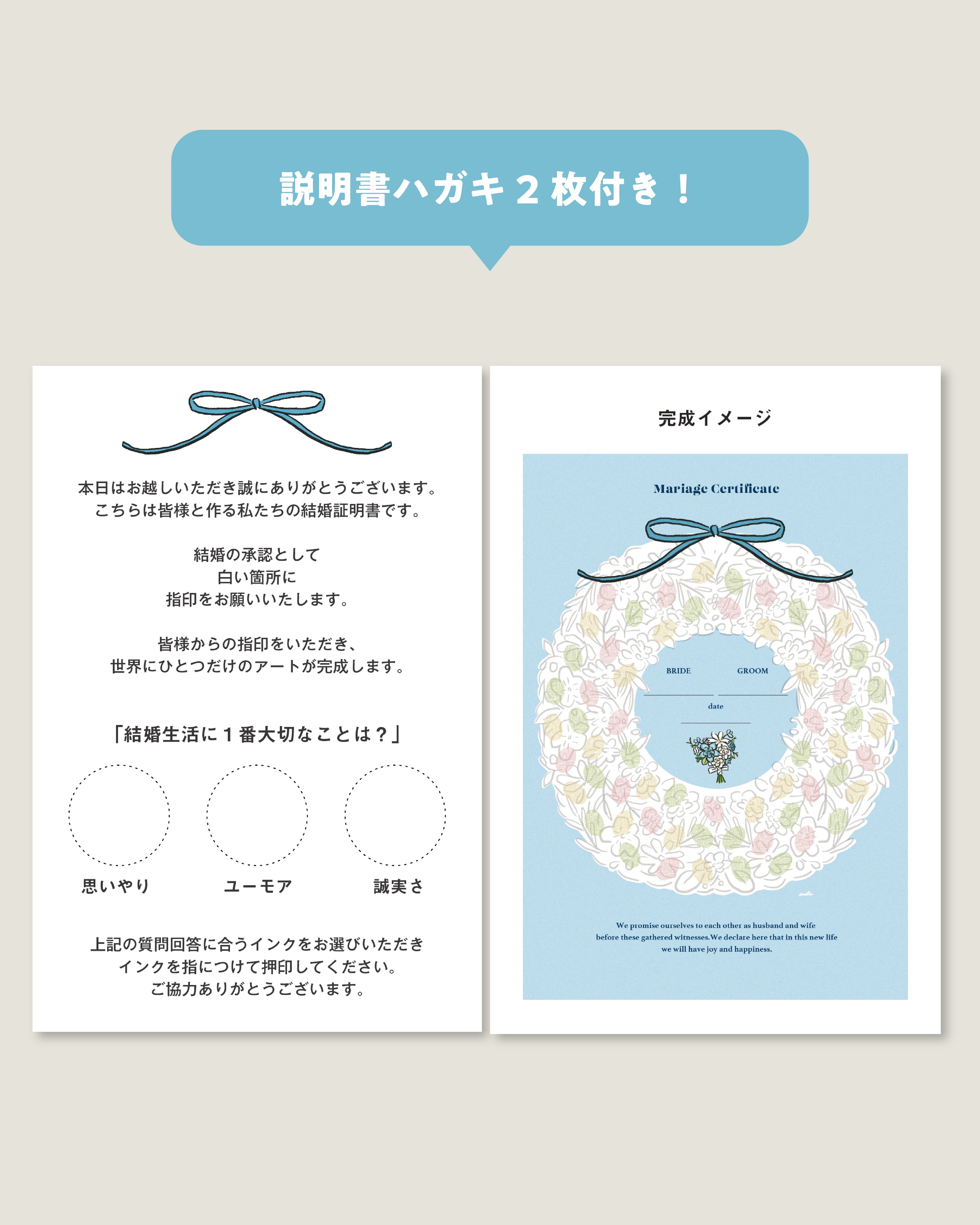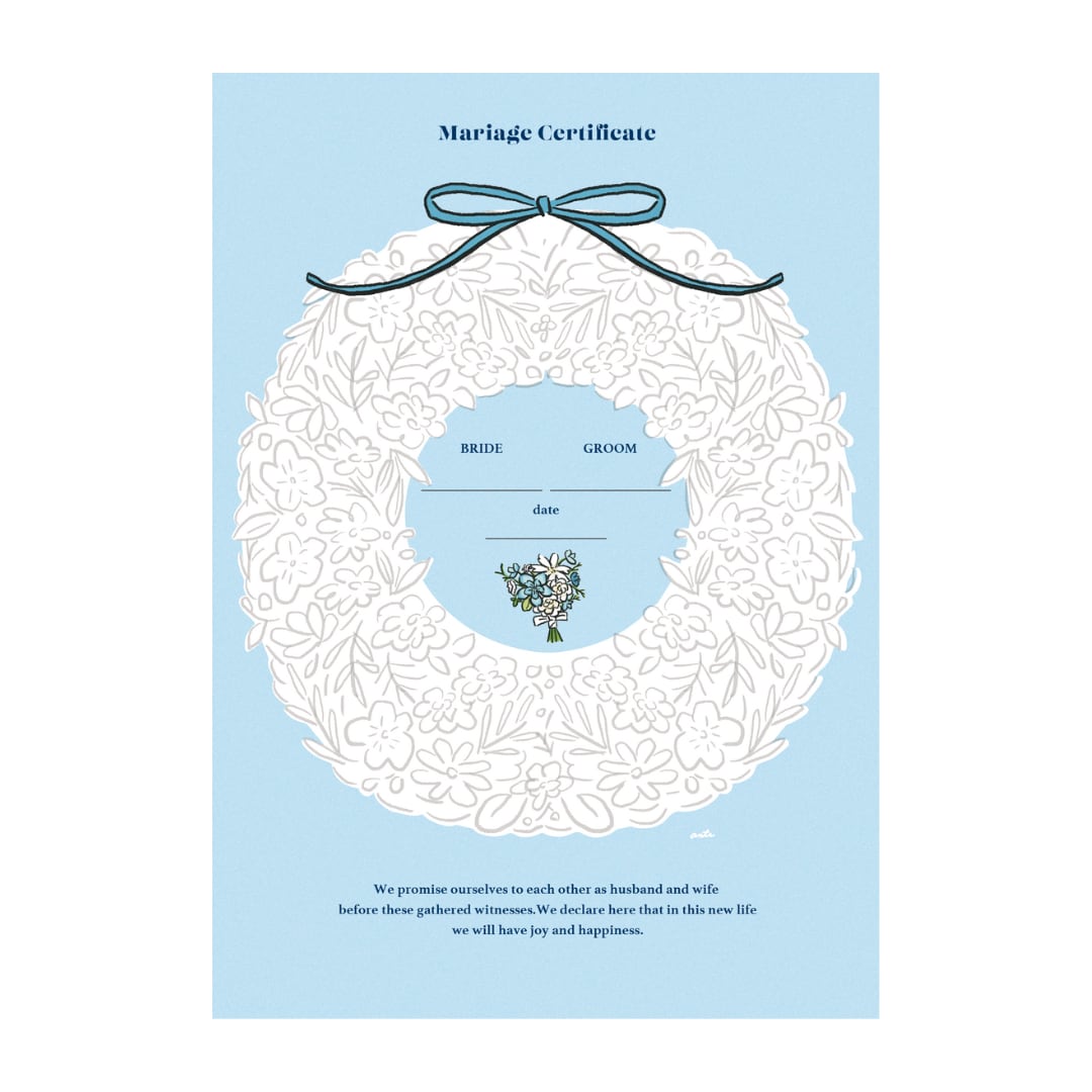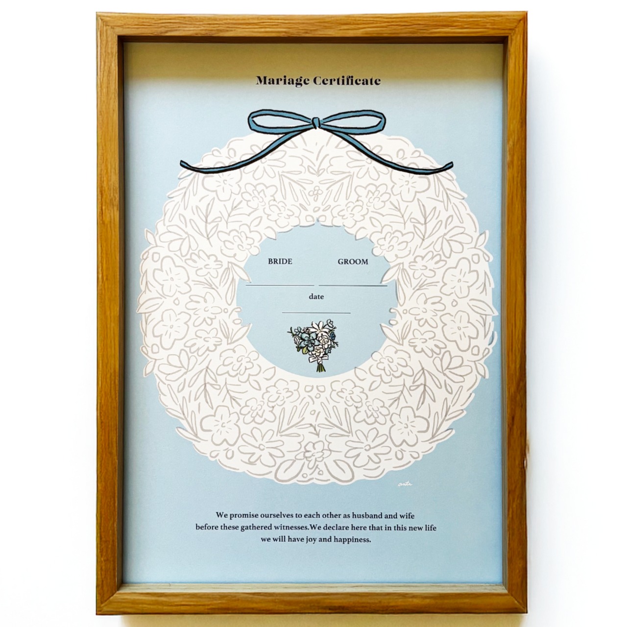 リース型の白枠にスタンプを押していただくデザインの結婚証明書です。